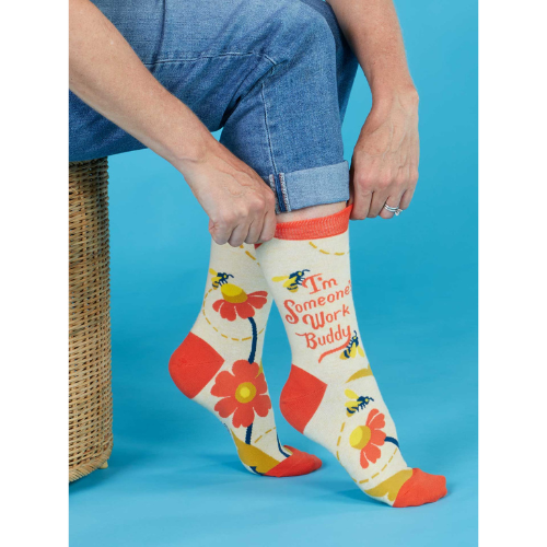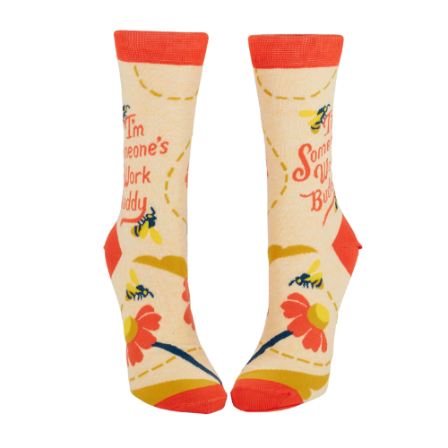 I’m Someone’s Work Buddy women’s crew socks with fun office-themed text.