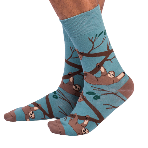Slothin’ Around men’s socks featuring a fun sloth design, cozy crew style, and comfortable fit — perfect for lounging and everyday wear.