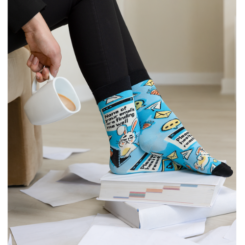 Print on Socks: "None of Your Emails Are Finding Me Well" and "Please Hesitate to Reach Out"